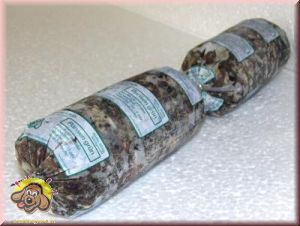 Frisches Rindfleisch und Pansen (800 g) grob gewolft und in sterilem, kochfesten Darm abgepackt.